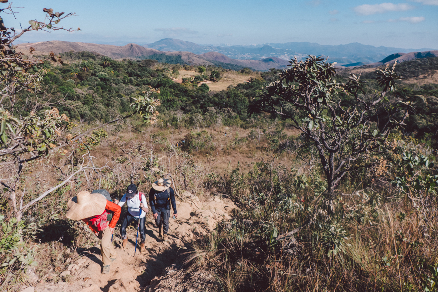 Amanhecemos no sábado com um café da manhã reforçado e começamos a caminhar leves, só com mochilas de lanches e água. As mochilas de roupas e barracas seguem de carro para Morro Vermelho, o destino da Travessia. Teremos cerca de 20km de caminhada, distribuídas em múltiplas paradas e paisagens. O Ar é nosso elemento de suspensão e de elevação dos sentimentos e sensações.